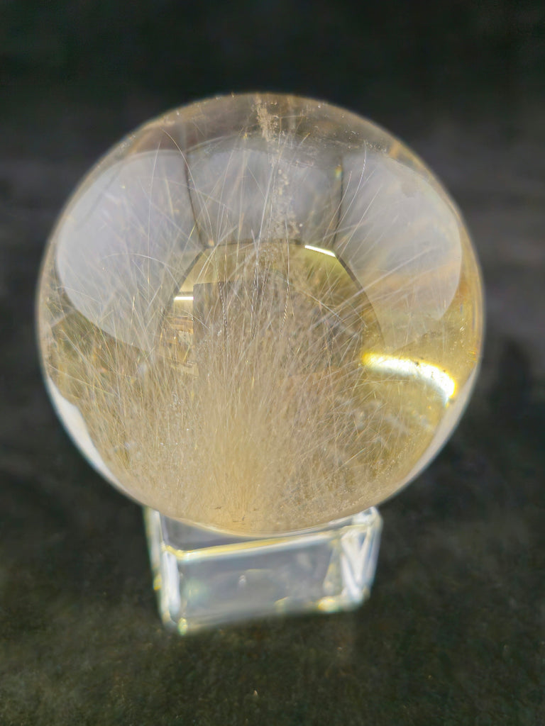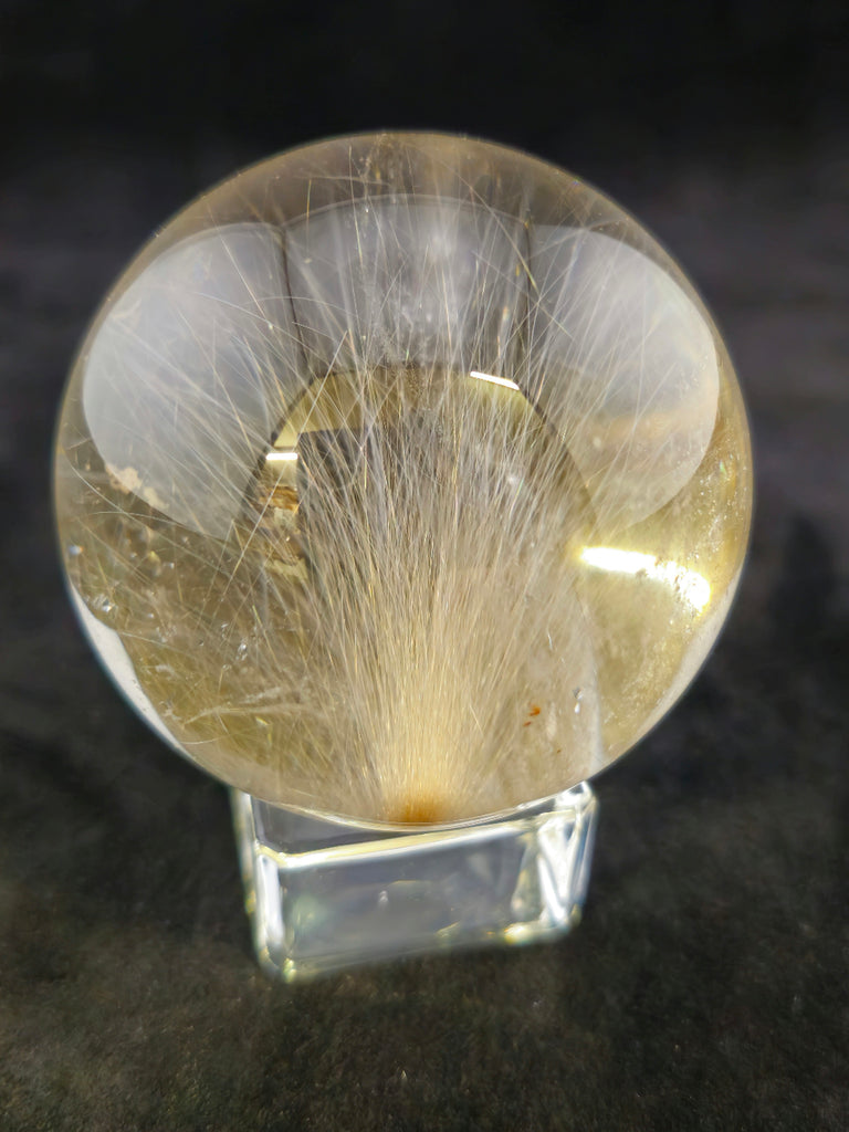 This striking sphere showcases a rare and highly sought-after formation of golden rutile needles suspended within clear quartz, creating a dazzling three-dimensional display from every angle. Precision-polished to a perfect sphere, the piece reveals dense, lightning-like rutile sprays that seem to float inside the crystal — a natural artwork millions of years in the making.